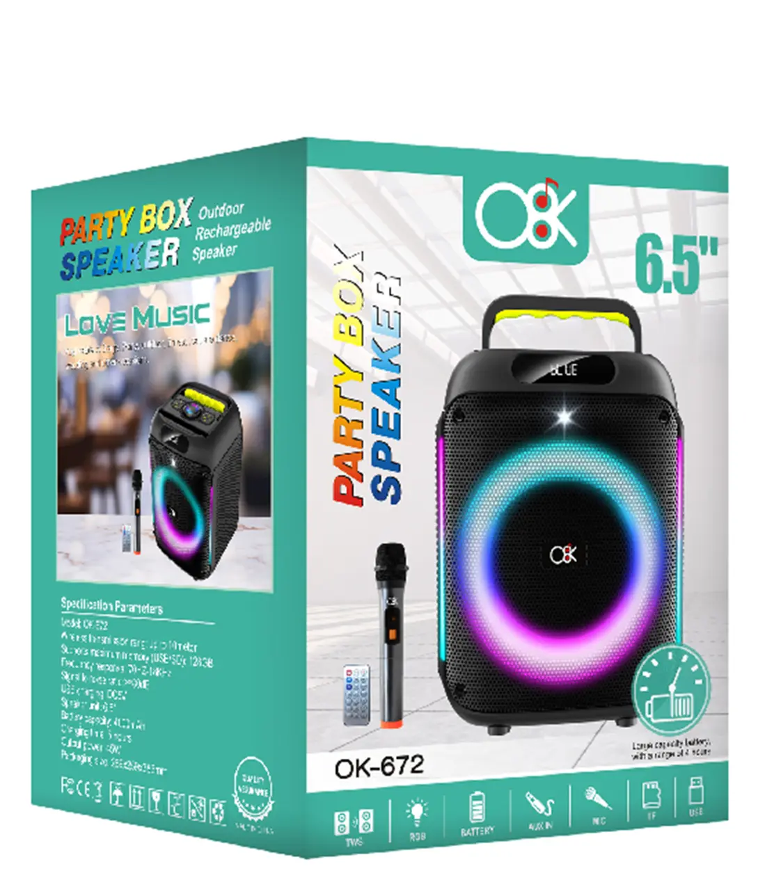 • בידורית קריוקי דגם OK-672רמקול בגודל 13 אינץ’ בעוצמה של 45W עם מיקרופון אלחוטי ושלט
